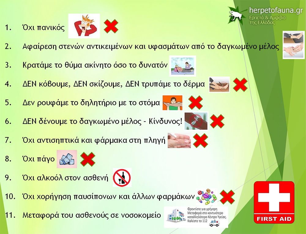 - Μην κόβετε ή σκίζετε το δέρμα για να ρουφήξετε το δηλητήριο. Όχι μόνο δεν ωφελεί σε τίποτα, αντιθέτως μάλιστα, το τραύμα και το σοκ που προκαλείται από την πράξη επιδεινώνουν την κατάσταση και τα συμπτώματα.
