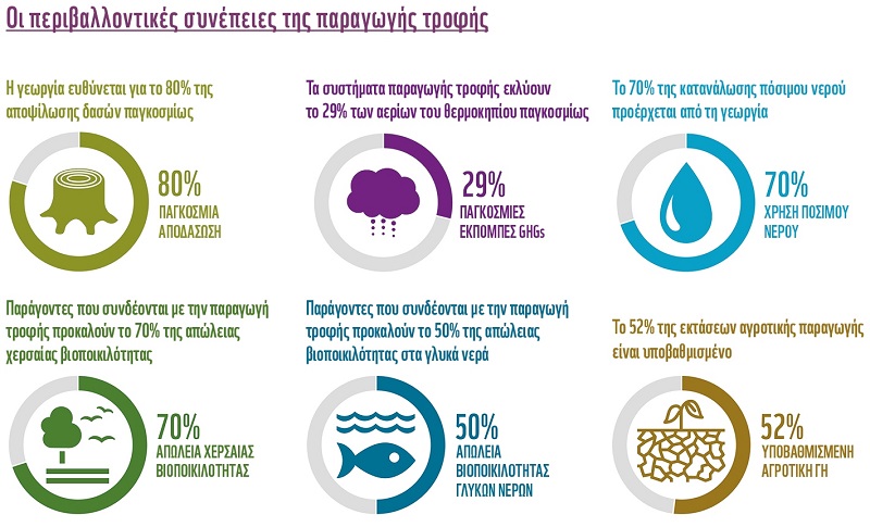• Περισσότερα στοιχεία για την κατάσταση σε παγκόσμιο επίπεδο: Σε παλαιότερη έρευνα έχει διαπιστωθεί ότι το 1/3 του παραγόμενου φαγητού, (1,3 δισεκατομμύρια τόνοι τροφής, αξίας περίπου 1 τρισεκατομμυρίου δολάρια) καταλήγει είτε να σαπίζει στους κάδους απορριμμάτων καταναλωτών ή λιανέμπορων, είτε να καταστρέφεται λόγω κακών πρακτικών μεταφοράς ή συγκομιδής. Την ίδια στιγμή, η παραγωγή τροφής -συμπεριλαμβανομένων των αγροτικών καλλιεργειών, της κτηνοτροφίας και της υδατοκαλλιέργειας– αποτελεί σημαντική απειλή για το περιβάλλον. Χρησιμοποιεί το 70% του καθαρού νερού και το 34% της γης, ενώ για την παραγωγή τροφίμων καταστρέφονται σημαντικοί βιότοποι, θέτοντας σε κίνδυνο εξαφάνισης χιλιάδες είδη σε όλο τον κόσμο.