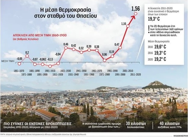 Την ανησυχητική «καυτή αγκαλιά» της κλιματικής κρίσης νιώθει ειδικά την τελευταία δεκαετία η Αθήνα, σύμφωνα με την επεξεργασία στοιχείων του Εθνικού Αστεροσκοπείου Αθηνών, που για πρώτη φορά αποτυπώνουν με τόσο ανάγλυφο τρόπο την επίδραση της κλιματικής αλλαγής στο Λεκανοπέδιο. Η δεκαετία 2011-2020 είναι η θερμότερη όλων των εποχών για την Αθήνα, με μέση θερμοκρασία τους 19,03 βαθμούς Κελσίου στον μετεωρολογικό σταθμό του Αστεροσκοπείου (ΕΕΑ) στο Θησείο. Μάλιστα, η δεκαετία αυτή είναι ήδη κατά 1,5 C θερμότερη σε σχέση με τη μέση θερμοκρασία της περιόδου 1860-1900! Δηλαδή -στην Αθήνα τουλάχιστον- έχουμε ήδη φτάσει στην «κόκκινη γραμμή» της ανόδου της θερμοκρασίας έως 1,5 C, που είχε θέσει η παγκόσμια Σύνοδος για το Κλίμα στο Παρίσι το 2015, έτσι ώστε να μην υπάρχει γενικευμένη απορρύθμιση. Είναι επίσης αξιοσημείωτο πως τα έξι θερμότερα έτη των τελευταίων 160 χρόνων στην Αθήνα σημειώθηκαν την περίοδο 2011-2020.